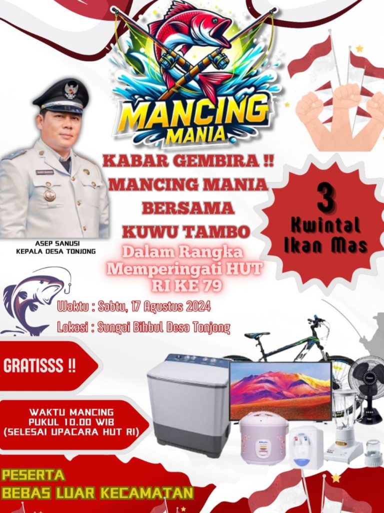 Kab.Tasikmalaya, kabarsakti.com – Dalam rangka memperingati sekaligus memeriahkan Hari Ulang Tahun Republik lndonesia (HUT-RI) ke-79, Kepala Desa Tonjong Asep Sanusi atau yang lebih akrab dengan panggilan Asep Tambo, mengadakan acara gebyar mancing.