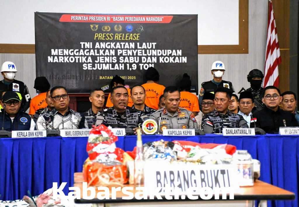 Jakarta, KabarSakti.com – TNI AL melalui Pangkalan TNI AL Tanjung Balai Karimun (Lanal TBK) pada Selasa (13/5/2025) berhasil menggagalkan penyelundupan narkoba jenis sabu seberat 705 Kg dan kokain seberat 1.200 Kg senilai Rp.7,057 Triliun yang dimuat menggunakan kapal ikan asing yang mencoba memasuki perairan Indonesia melalui Selat Durian, Kepulauan Riau.