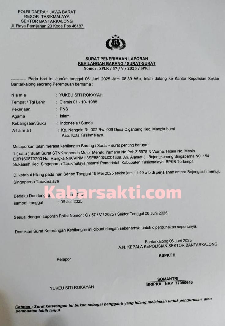 Tasikmalaya, KabarSakti.com – Yukeu Siti Rokayah, seorang Pegawai Negeri Sipil (PNS) yang tinggal di Kampung Nangela RT 02/06, Desa Cigantang, Kecamatan Singaparna, Tasikmalaya, Jawa Barat, melaporkan kehilangan Surat Tanda Nomor Kendaraan (STNK) miliknya, Sabtu 7 Juni 2025.