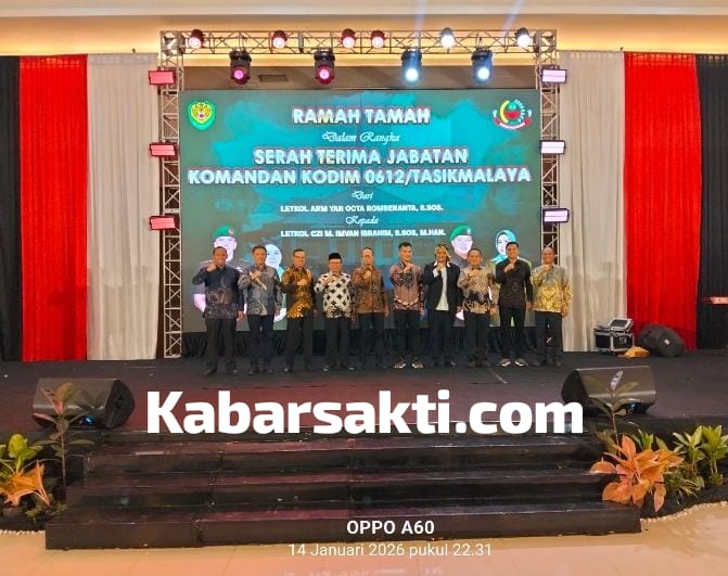 Tasikmalaya, KabarSakti.com – Kodim 0612/Tasikmalaya menggelar acara pisah sambut Dandim 0612/Tsm, pada Rabu malam, 14 Januari 2026. Acara ini menandai pergantian tugas dari Letkol Arm Yan Octa Rombenanta, S.Sos., kepada Letkol Czi M. Imvan Ibrahim, S.Sos., M.Han., yang dihadiri oleh Forkopimda Kabupaten dan Kota Tasikmalaya serta tamu undangan lainnya. Suasana hangat mewarnai acara pisah sambut yang berlangsung di Hotel Asri Tasikmalaya.